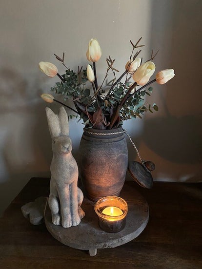 Prachtige landelijke sobere houten pot, gevuld met 2 bosjes real touch tulpen, en echte eucalyptus takken.